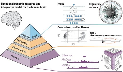 大脑是人体最复杂的器官。健康的大脑发育和神经功能依赖于转录组的精确时空调控,而转录组在不同大脑区域和细胞类型中有很大差异。已有研究揭示了神经精神病遗传学中的高风险多基因结构,涉及多种常见变异和罕见变异。但由于大多数遗传变异存在于基因组的非编码区,因此人们对大脑基因调控和表观基因组尚没有全面的了解,这极大地阻碍了基因突变与疾病之间联系的研究。